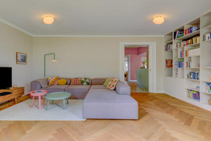 Ein ausgewogenes Farb- und Materialkonzept sowie der durchgehende Fischgrät-Holzboden aus Eichenstäben verleihen dem Haus eine warme, einladende Atmosphäre – Historie und Moderne bilden eine harmonische Symbiose.