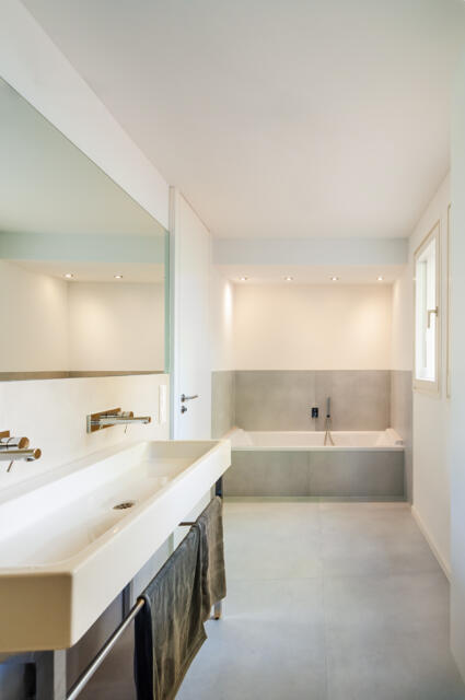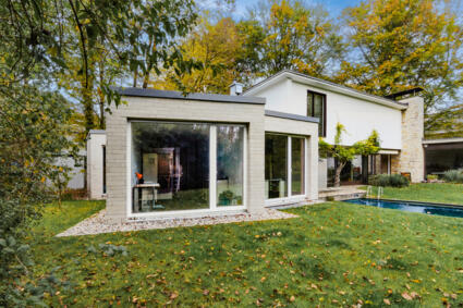 Die vier neuen Räume sind sternförmig um den Flur gruppiert und jeweils mit einem eigenen, direkten Zugang zum Garten ausgestattet. Ein gusseiserner Kaminofen im Flur schafft Behaglichkeit und setzt optisch einen ansprechenden Akzent. Bodentiefe Glasfronten sorgen für eine optimale Belichtung und verleihen Leichtigkeit und Transparenz. Alle Räume sind mit dunklen Eichenholzböden ausgestattet, die Bäder erhalten durch Böden und Wandbeläge aus Naturstein eine exklusive Note. Eine Teilunterkellerung schaffte zusätzlichen Stauraum.