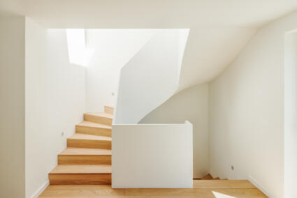 Das alte Treppenhaus wurde abgebrochen und zugunsten einer optimalen, modernen Grundrissgestaltung an anderer Stelle neu aufgebaut. Krönender Abschluss des quadratischen Treppenhauses ist ein großes Dachflächenfenster zentral über dem Treppenauge, wodurch alle Ebenen bis ins Erdgeschoss mit Tageslicht versorgt werden.