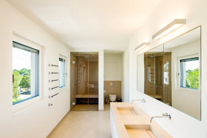 Die Nebenräume und Erschließungsflächen ordnen sich konsequent entlang der Nordseite zur Straße hin an, während die Wohnbereiche mit ihren großflächigen, bodentiefen Verglasungen nach Süden zum Garten geöffnet sind und viel Privatsphäre bieten.
