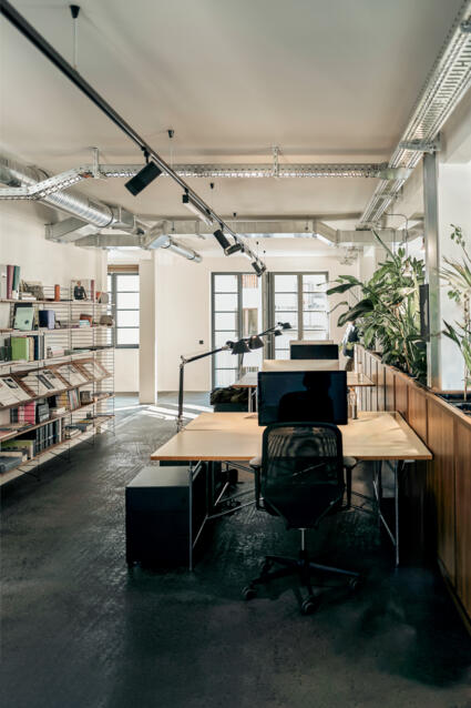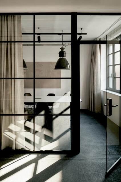 So sind moderne Gewerbe- und Büroflächen entstanden, die den Charme des historischen Industriegebäudes erhalten. Alle Fenster haben eine charakteristische Sprosseneinteilung nach historischem Vorbild bekommen und wurden teils zu großzügigen Fenstertüren erweitert, die auf neu angebaute Balkone führen. Die einzelnen Etagen wurden durch Glastrennwände in schwarzen Metallrahmen zoniert. Zusammen mit den dunklen Böden aus Gussasphalt und dem freigelegten Sichtmauerwerk sind lichtdurchflutete Loft-Flächen entstanden, die ein authentisches Flair von Industriearchitektur in die Gegenwart der alten Fabrik übertragen.