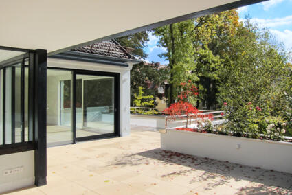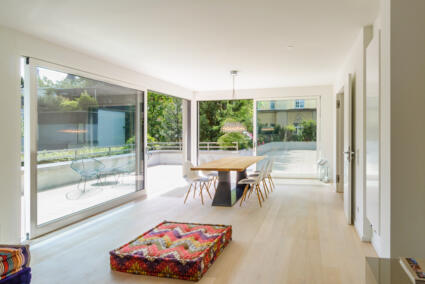 Durch die Sanierung und Umstrukturierung des Grundrisses entstanden in Verbindung mit dem offenen Wohn- und Essbereich völlig neue Perspektiven. Großformatige Hebeschiebetüren führen auf die weitläufige Terrasse mit Blick auf den Kanal und sorgen bei sommerlichen Temperaturen für ein mediterranes Wohngefühl. Das Farb- und Materialkonzept orientiert sich außen am Bestand, im Innenbereich unterstützen Eichenparkett, helle Wände und die matt-weißen Lackoberflächen der Einbaumöbel den lichtdurchfluteten Charakter.