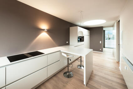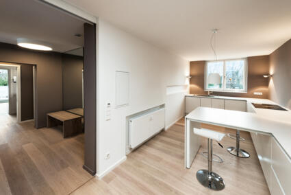 Die ehemals gefangene, dunkle Essplatz-Situation mit abgeschlossener Küche bekommt durch die Zusammenlegung der beiden Räume und einen Mauerdurchbruch zum Wohnzimmer eine entscheidende Aufwertung. Zusätzliches Tageslicht von der Südseite verwandelt die Wohnung effektvoll. Eine vierteilige Schiebetürenanlage schafft die größtmögliche Öffnung vom Wohn-Essbereich zur umlaufenden Dachterrasse. Mit einer besonderen Außenfliese belegt, bietet sich hier ein hochwertiger Außenraum.