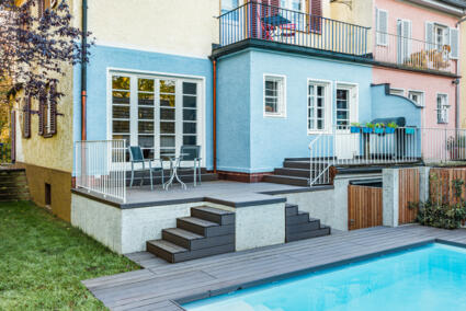 Wo vorher eine geschlossene Fassade weder Einblick noch Ausblick gab, wurde nun eine Öffnung geschaffen und bodentiefe Fenstertüren im historischen Stil eingebaut. Über den holzbeplankten Freisitz gelangt man jetzt vom Esszimmer direkt zum Pool und in den Garten. Und im Erdgeschoss hat man selbst vom anschließenden Wohnzimmer einen Blick auf das Blau des Pools.