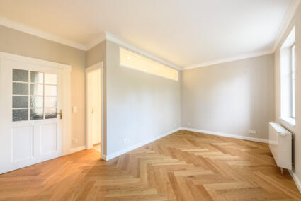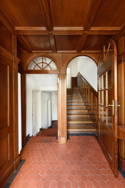 Die bestehenden Oberflächen von Holzverkleidungen, Fenstern, Türen sowie Bodenbelägen wurden soweit möglich sorgfältig aufgearbeitet oder entsprechend dem historischen Vorbild nachgebaut. Im Rahmen der Sanierung wurden alle Sanitär- und Elektroinstallationen erneuert, um neuesten technischen Standard zu gewährleisten. Durch das Tieferlegen der Bodenplatte im Gartengeschoss konnte mehr Raumhöhe gewonnen werden. So wichen niedrige Nebenräume einem großzügigen, repräsentativen Wohnraum, der ebenerdig an den Garten anschließt