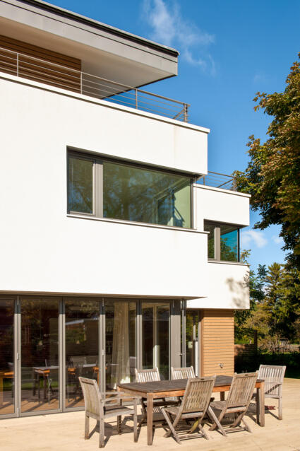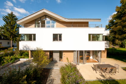 1920 wurde in München-Johanneskirchen eine Siedlung kleiner Doppelhäuser mit großem Garten zur Selbstversorgung errichtet. Um den heutigen Anforderungen eines 5-Personen-Haushaltes Rechnung zu tragen, wurde eine Hälfte des Doppelhauses zu Gunsten eines Neubaus abgetragen. Herz des neu entstandenen Einfamilienhauses ist ein erweiterter Essbereich mit integrierter Küche. Schwellenlose, raumhohe Öffnungselemente lassen im Erdgeschoss Innen- und Außenraum nahtlos ineinander übergehen.