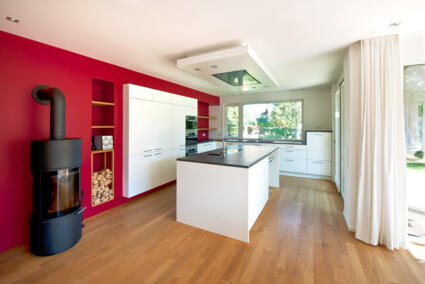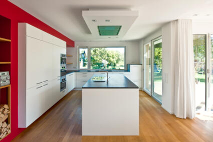 Jedes der drei geräumigen Kinderzimmer im Obergeschoß erhielt eine deckenhohe, großzügige Verglasung über Eck. Der Elternbereich ist im Dachgeschoss mit weiträumiger Dachterrasse situiert. Das Gebäude wurde in Holzbauweise ausgeführt. Heizung- und Brauchwassererwärmung erfolgen mittels Wärmepumpe. Zudem wurde eine Wärmerückgewinnungsanlage integriert, um eine ausreichende und angenehme Lüftung zu gewährleisten.